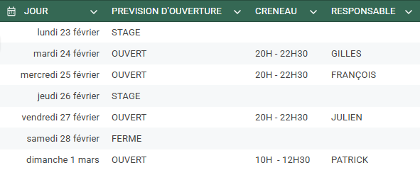 PLANNING D'OUVERTURE DE LA SALLE - VACANCES DE FEVRIER